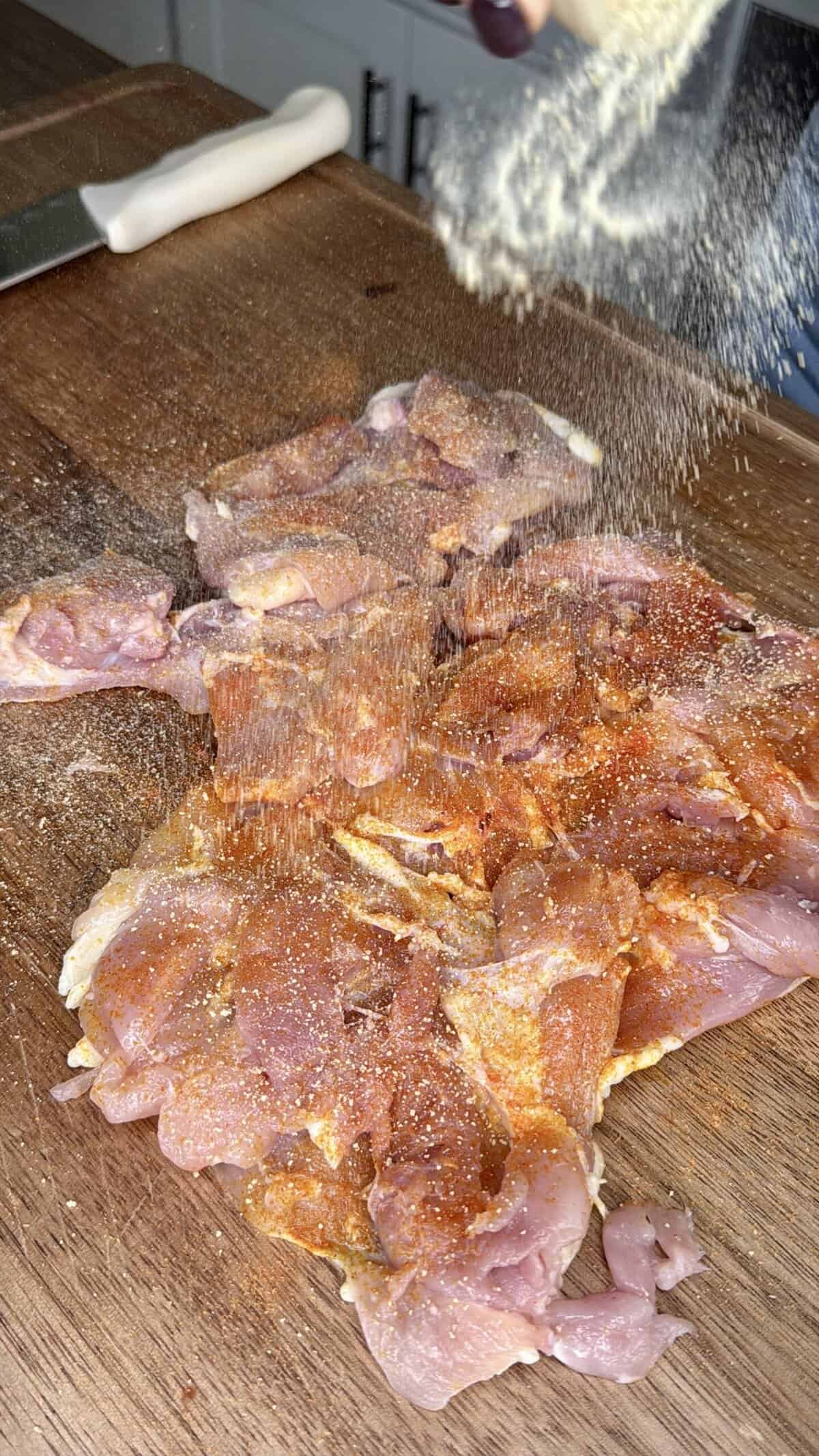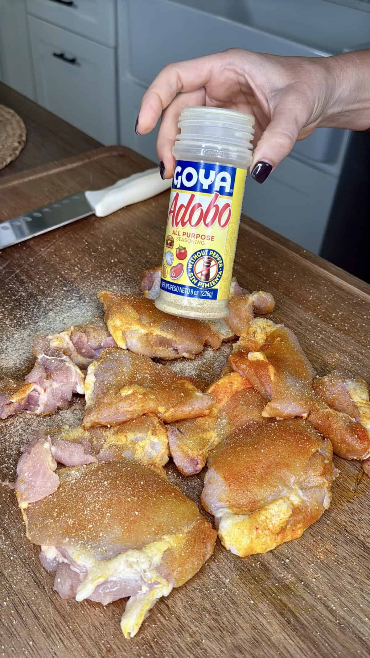 - Toss chicken chunks with sazón, adobo, and black pepper.