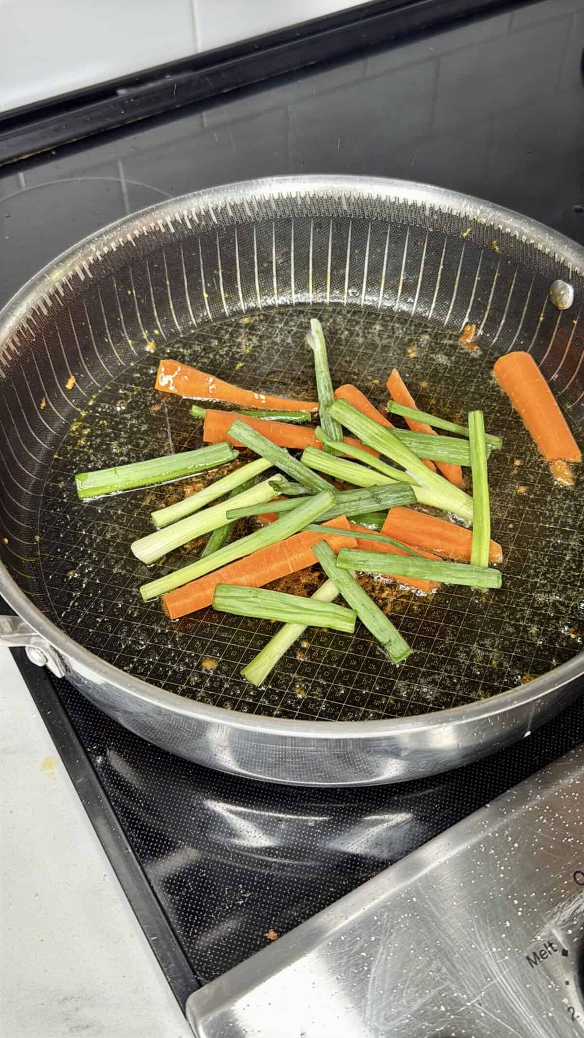 - In the same pot (using the same oil from the chicken), add carrot slices and green onion stalks. Sauté over medium-low heat for 5–6 minutes until softened and fragrant. Add garlic and cook for 1 minute more.