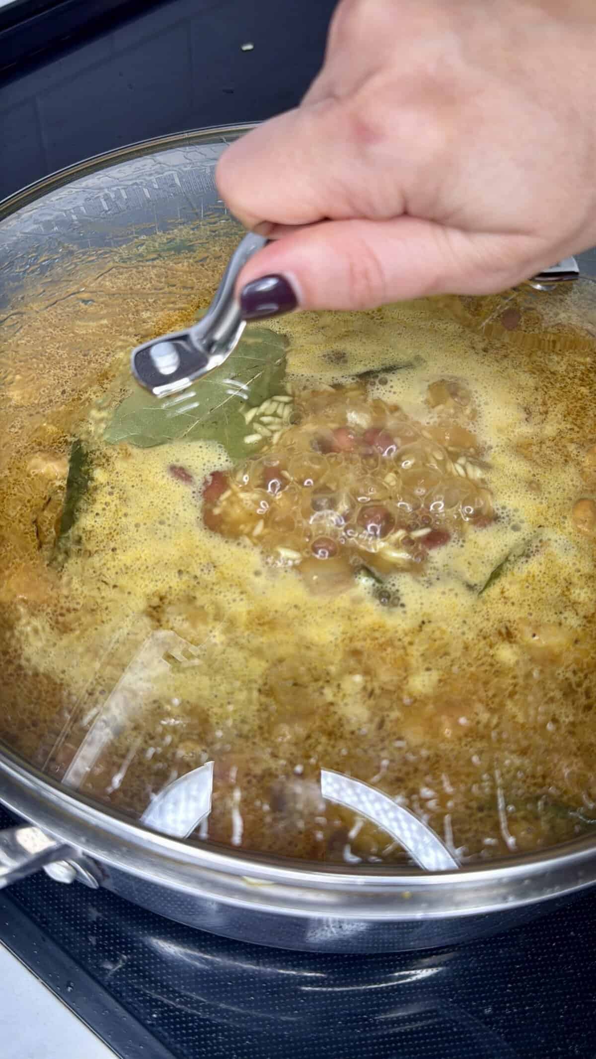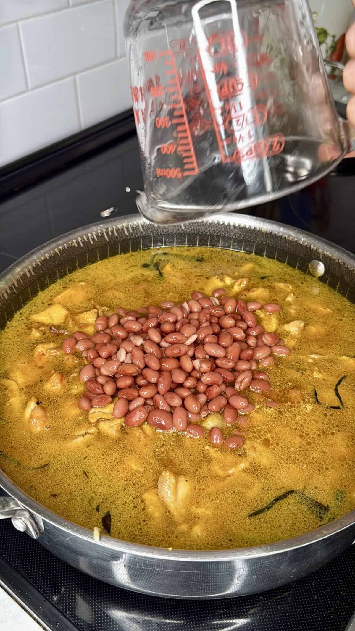 - Stir in 5 cups water, tomato bouillon, bay leaf, and the drained beans. Return chicken to the pot. Bring everything to a boil.