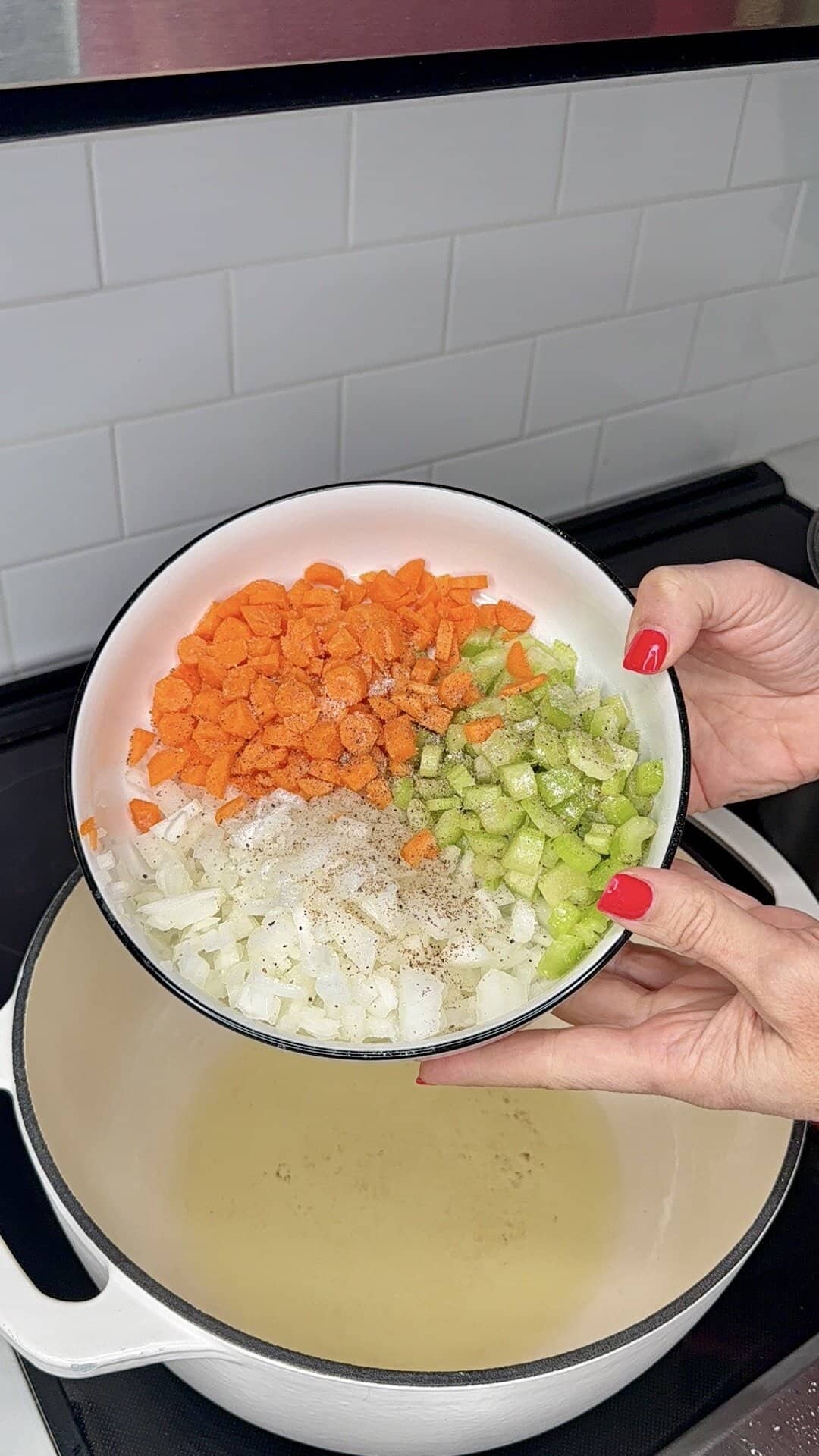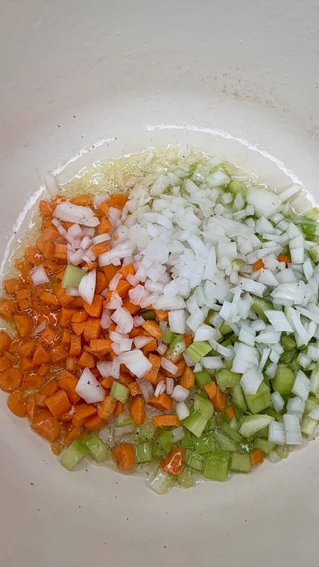 - Heat 4 tbsp olive oil in a large Dutch oven or heavy-bottomed pot over medium heat. Add carrots, celery, onion, salt, black pepper, and crushed red pepper flakes. Sauté about 15 minutes, stirring occasionally, until everything softens and turns lightly golden. Add garlic and cook a few minutes longer.