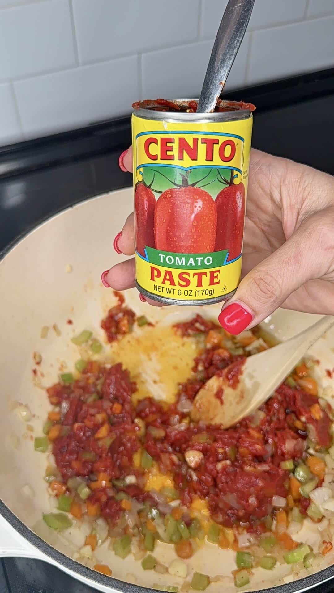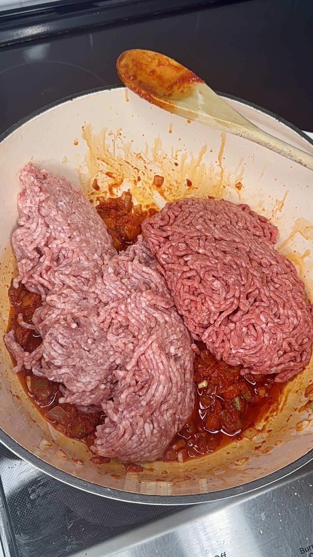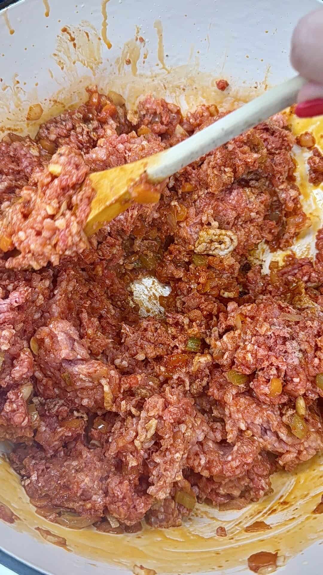 - Stir in the tomato paste and cook 3–5 minutes to deepen the flavor. Add the ground beef and pork, breaking it up as it cooks. Drizzle in the remaining olive oil if needed. Season again with salt and pepper, and cook until the meat is browned and crumbly.