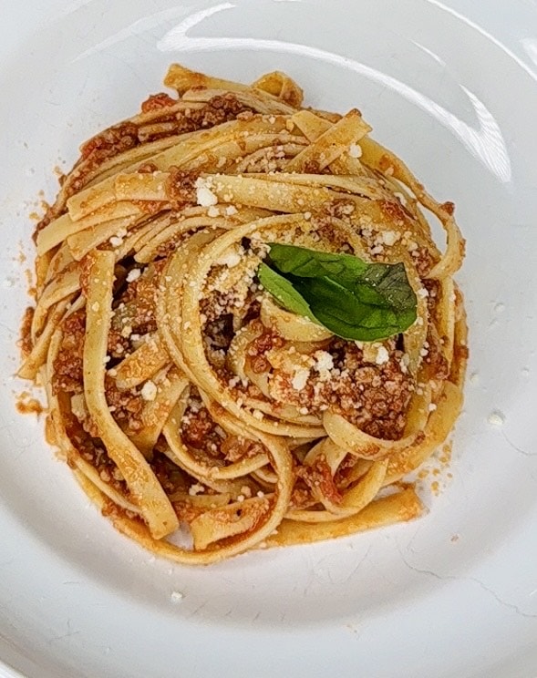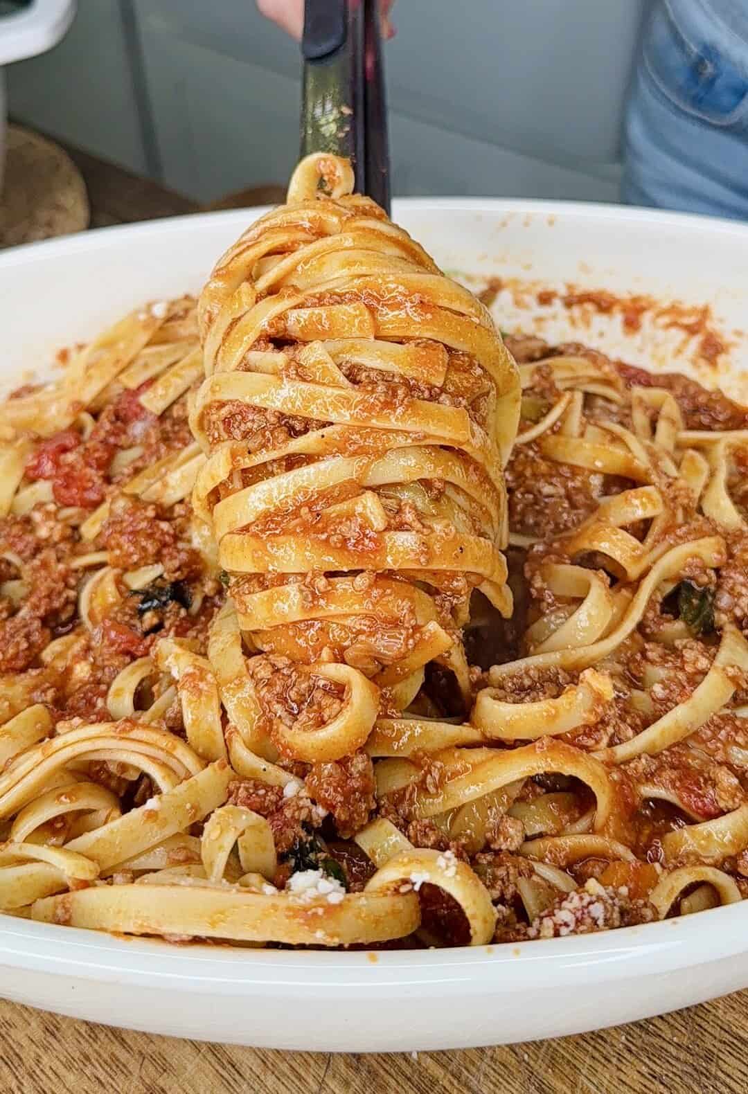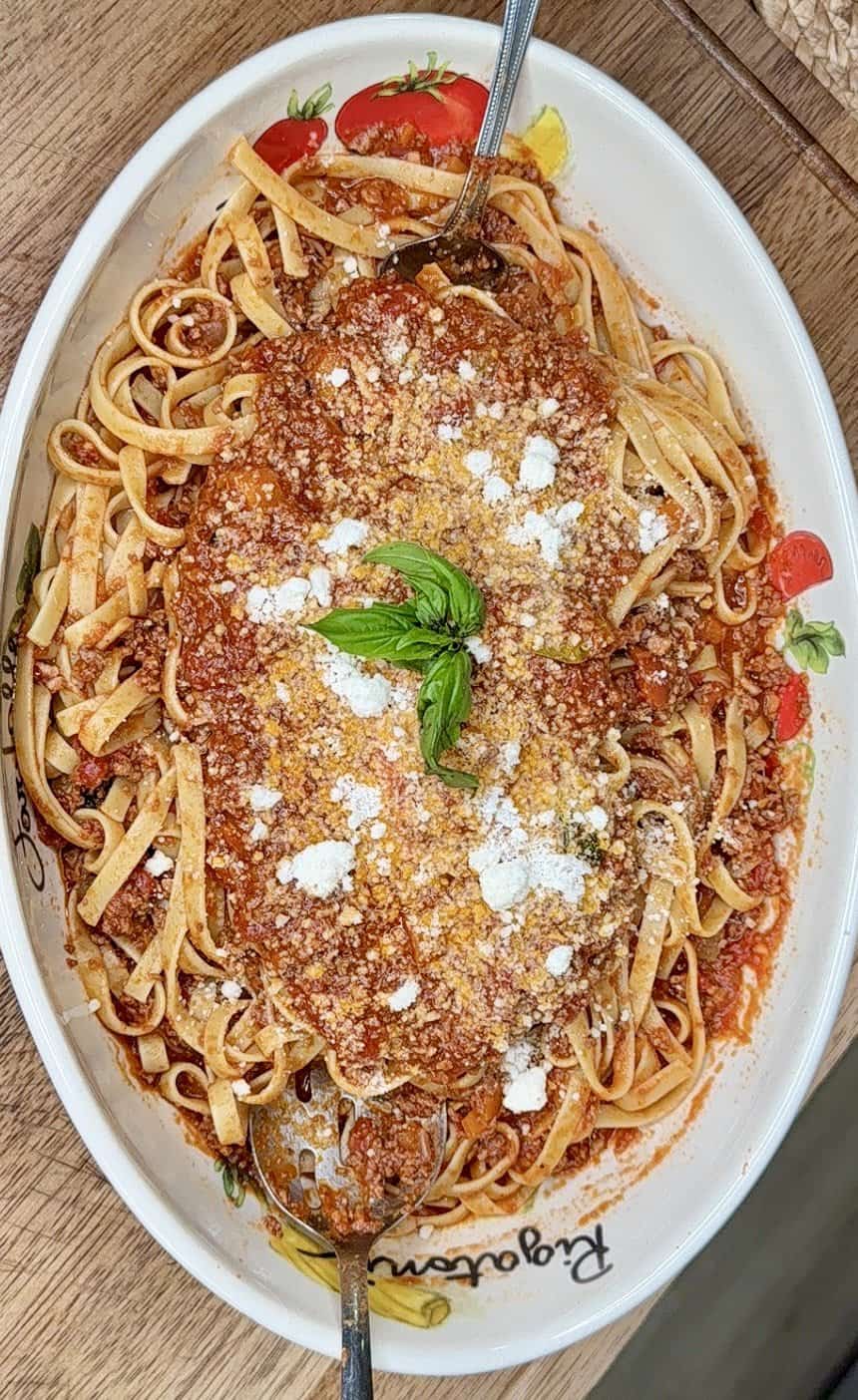 It’s built on layers of flavor — sautéed veggies, browned meat, tomato paste, red wine, and that slow, gentle simmer that makes the sauce cling perfectly to every noodle.