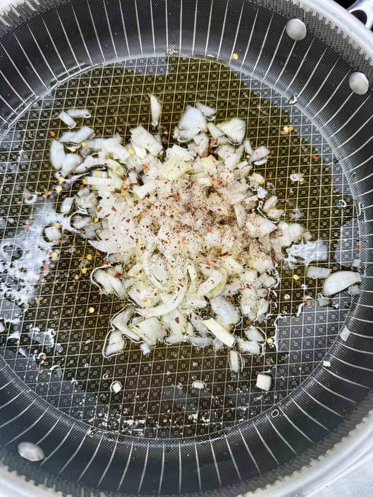 - In a large pot or Dutch oven, heat olive oil over medium heat. Add garlic, onion, and crushed red pepper. Cook until softened and fragrant, about 3–4 minutes.