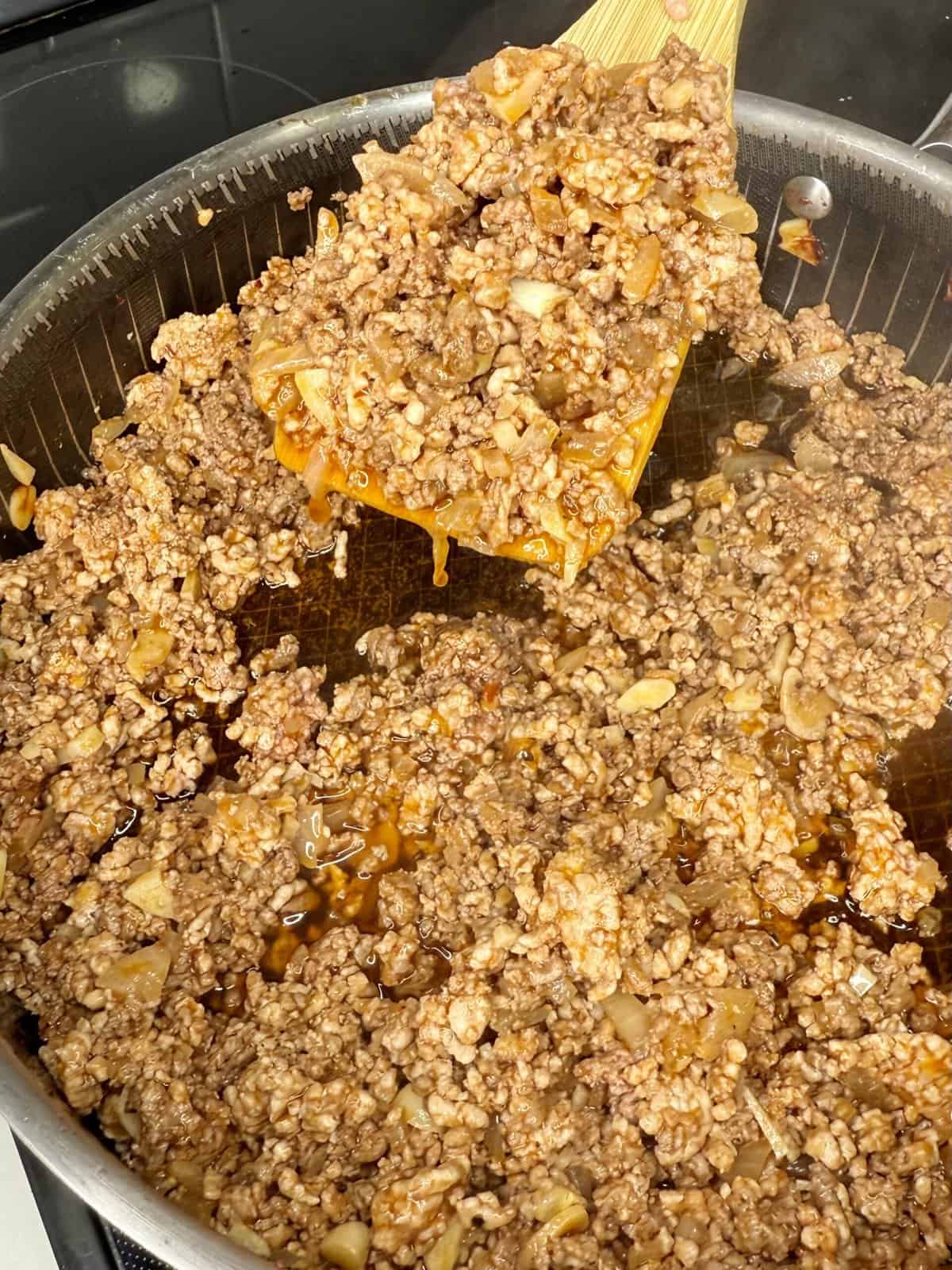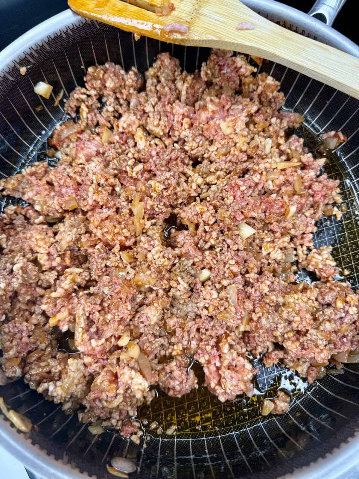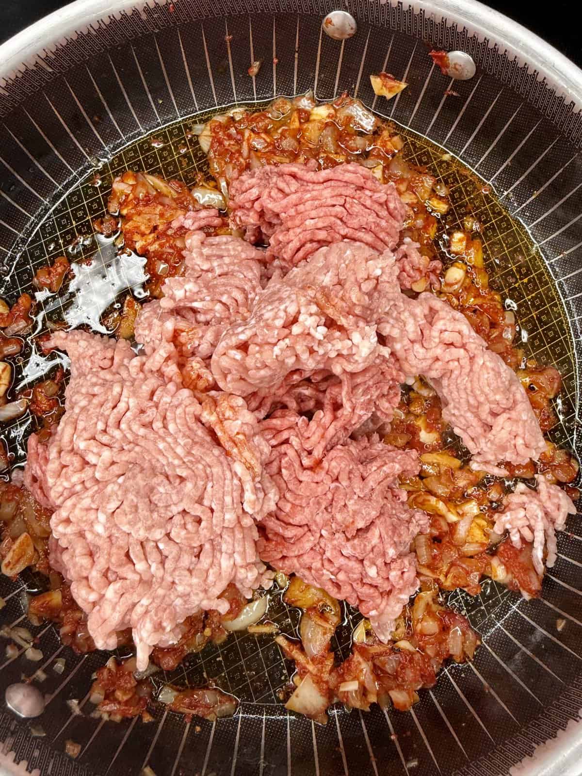- Add ground beef and ground pork. Season right away with salt and pepper. Cook until browned, breaking up into small pieces.