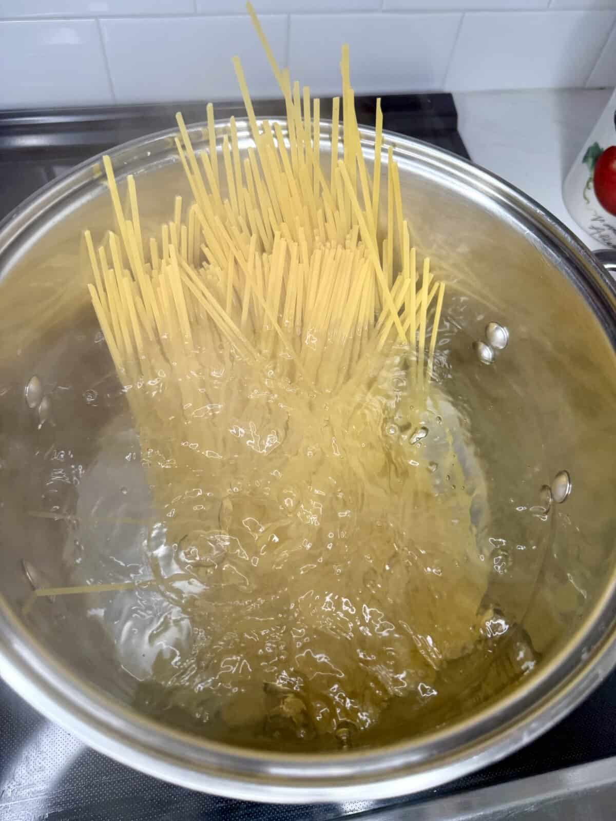 - Meanwhile, boil spaghetti in salted water until al dente. Reserve ½ cup pasta water.