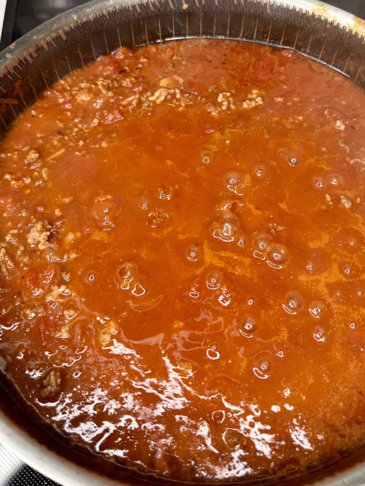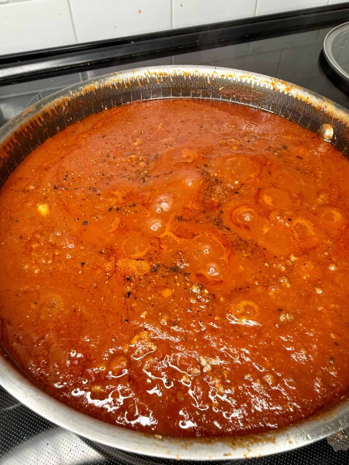 - Stir in the can of crushed tomatoes along with another ¼ cup of water swished from the can. Bring the sauce back to a boil for 5 minutes, then reduce to a simmer. Cover partially with the lid ajar and simmer for another 10 minutes. Taste and adjust salt and pepper again.